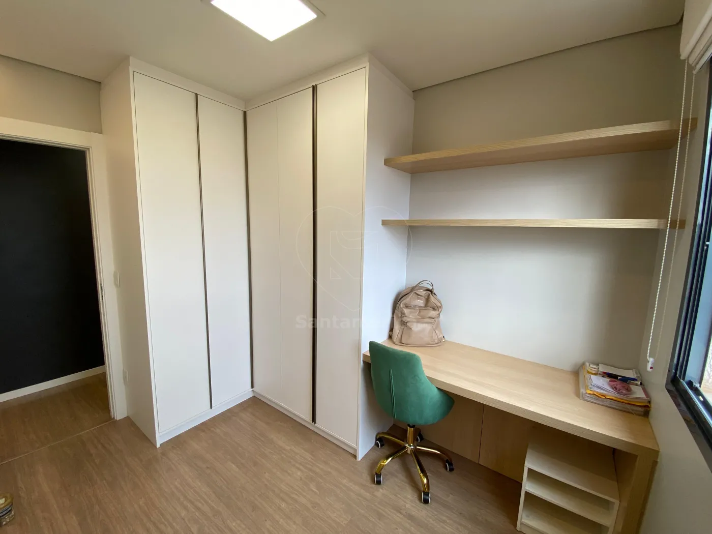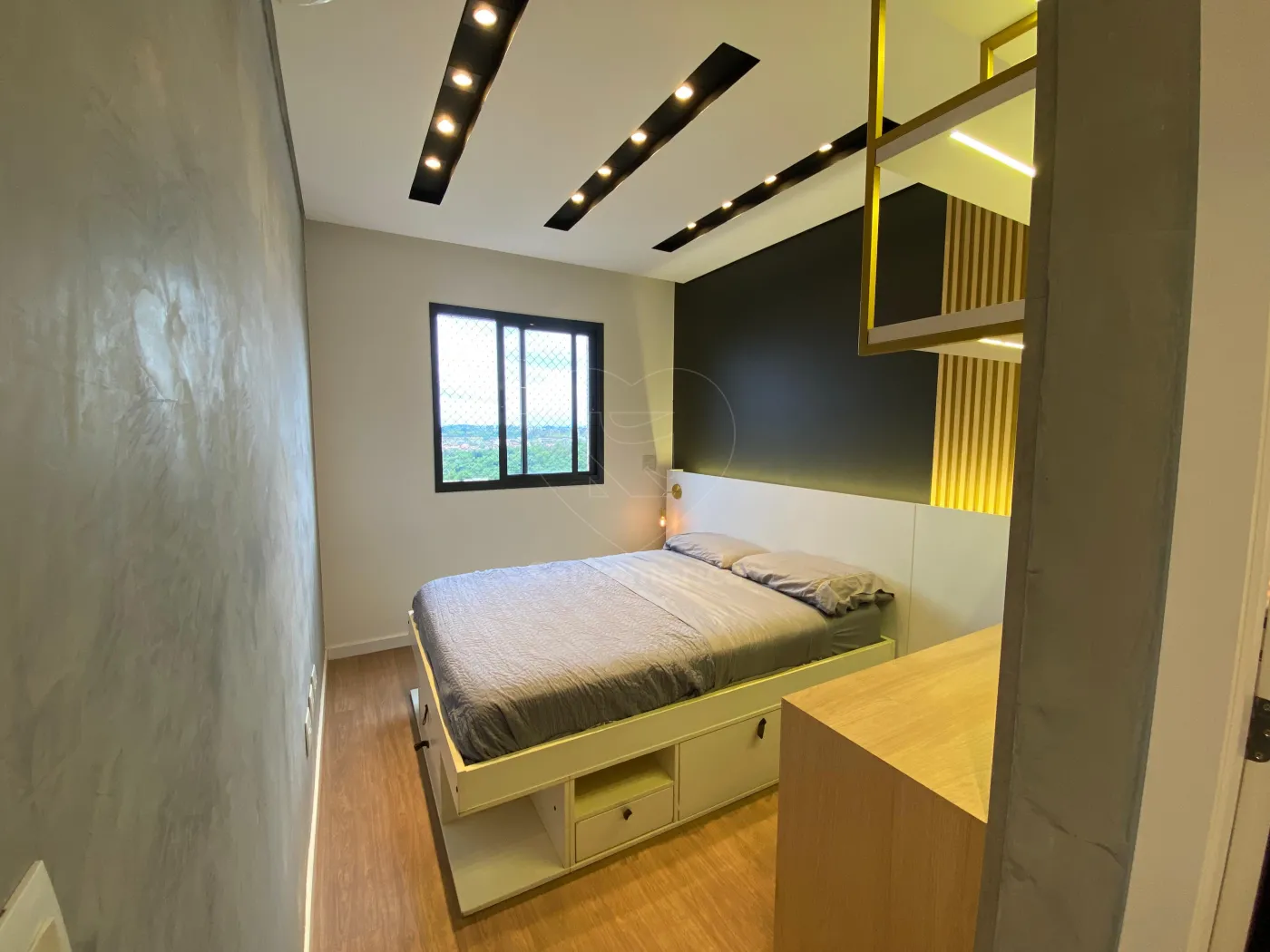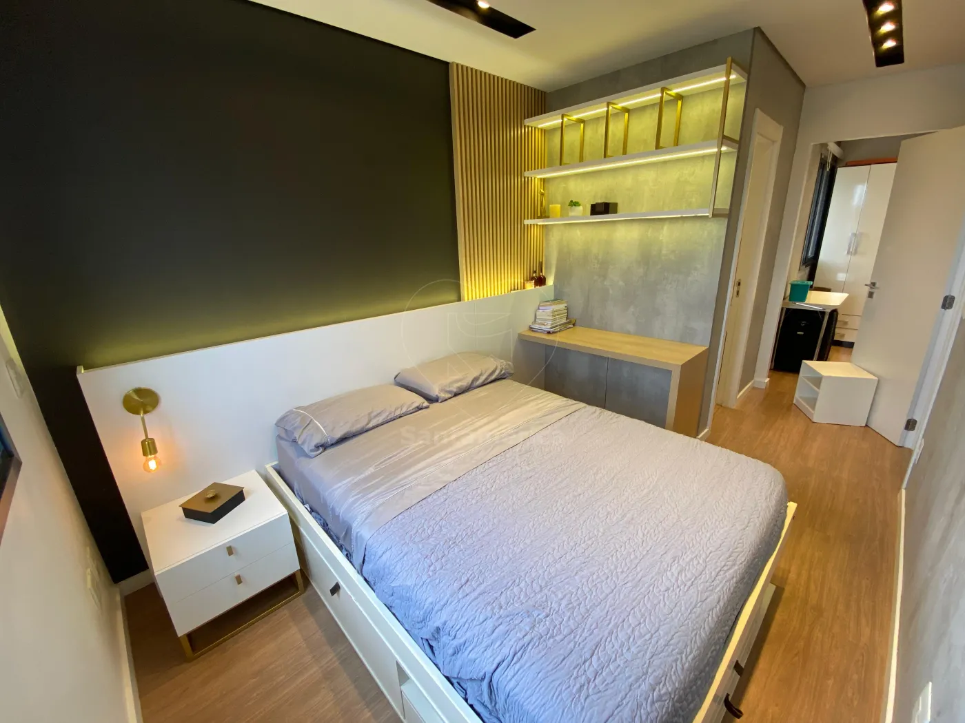 O imóvel é mobiliado e oferece conforto e praticidade em cada ambiente. Conta com 2 quartos, sendo 1 suíte com cama e closet, e 1 quarto com armários planejados e mesa de escritório, ideal para home office.