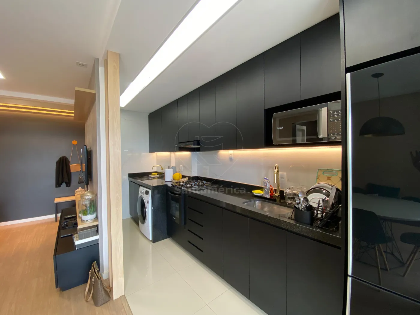 A cozinha está equipada com armários planejados, cooktop, forno embutido, micro-ondas, geladeira, sugar e mesa para refeições.