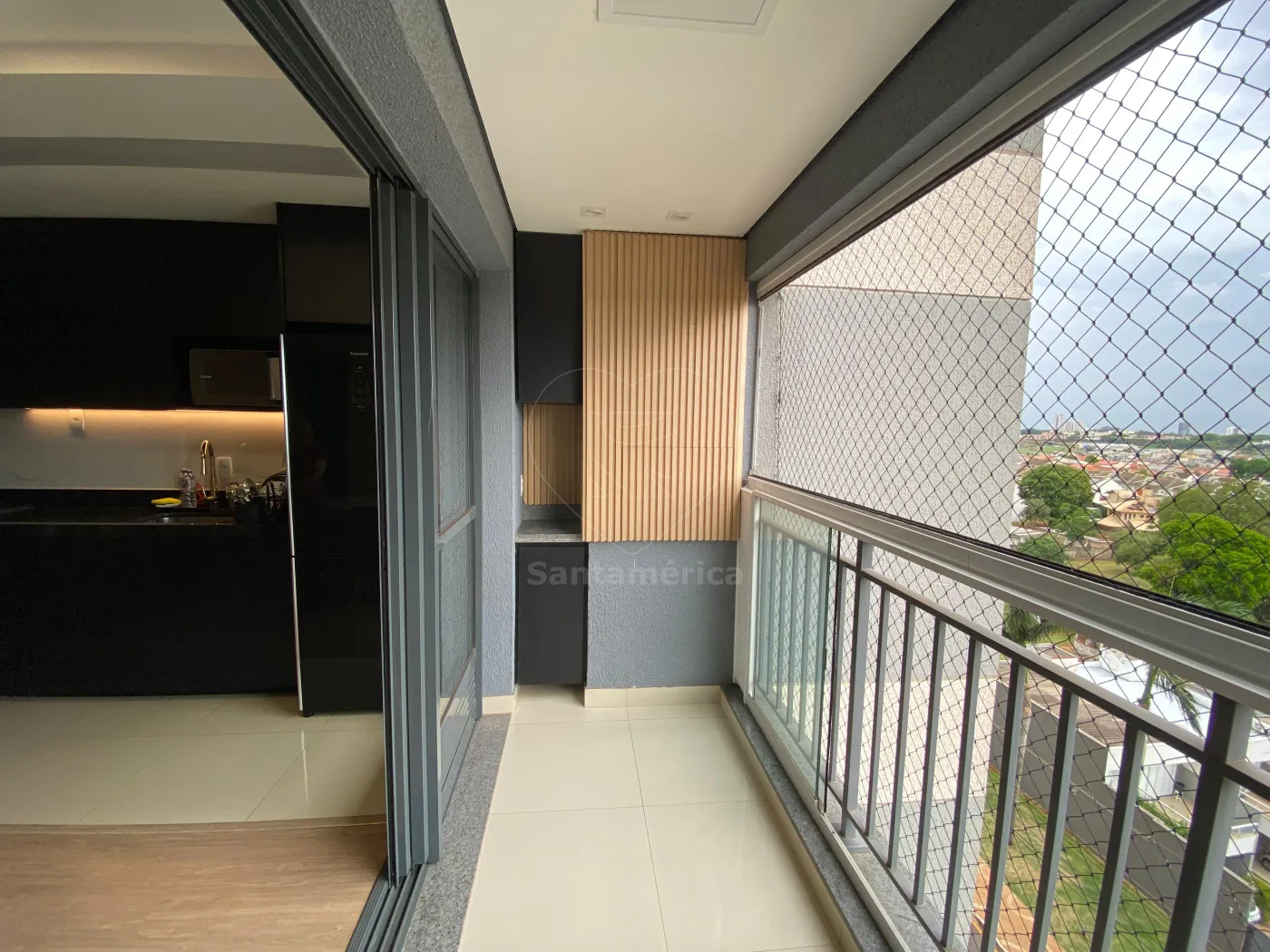 A sacada gourmet possui churrasqueira e fechamento em Skin Glass, perfeita para momentos de lazer.