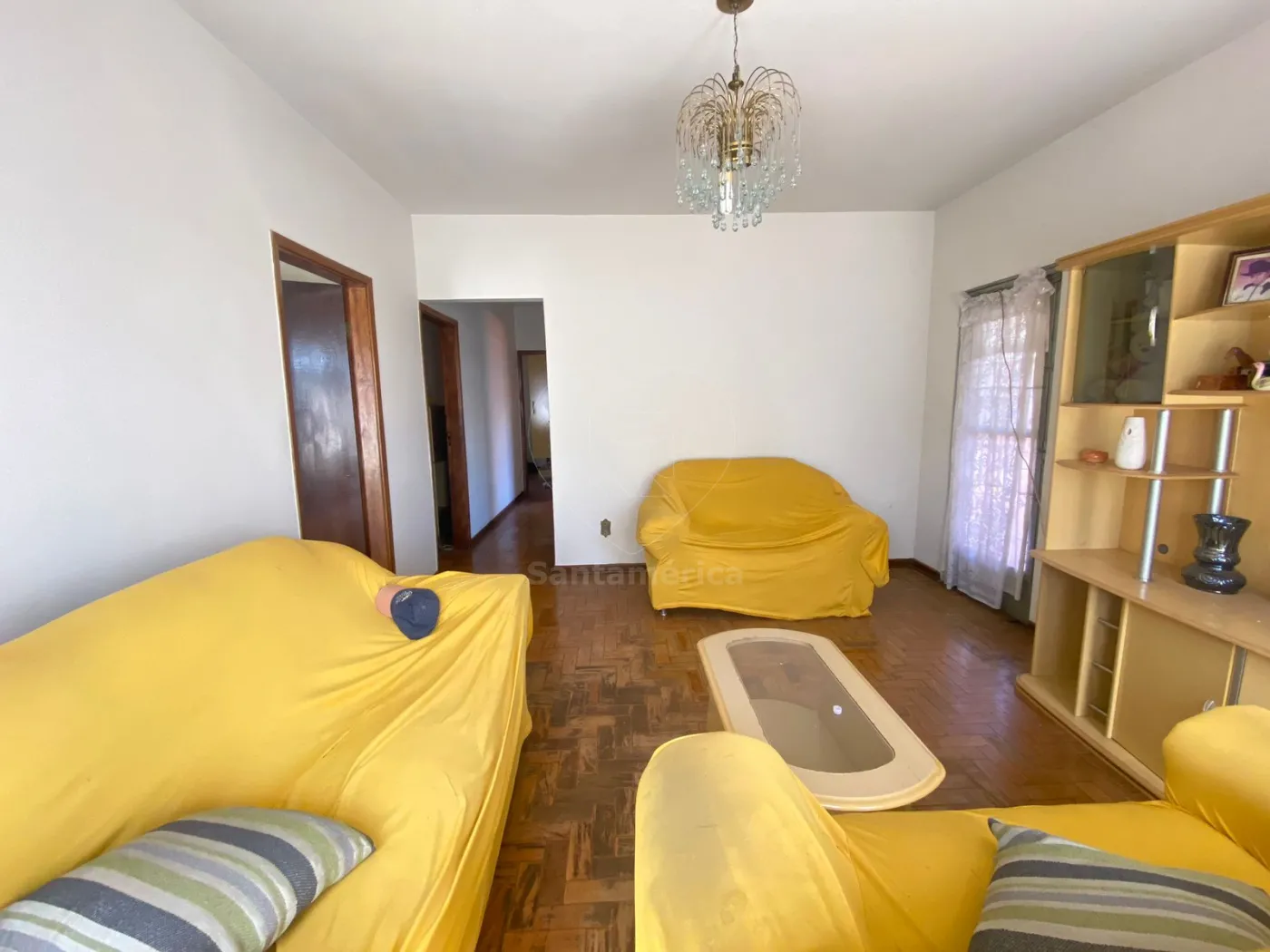 O imóvel conta com 3 dormitórios, todos equipados com armários e cama, além de sala de estar e sala de TV separadas, ambas mobiliadas com sofá e TV, cozinha completa com armários planejados, fogão e geladeira, 1 banheiro social que possui box e área de serviço independente.
