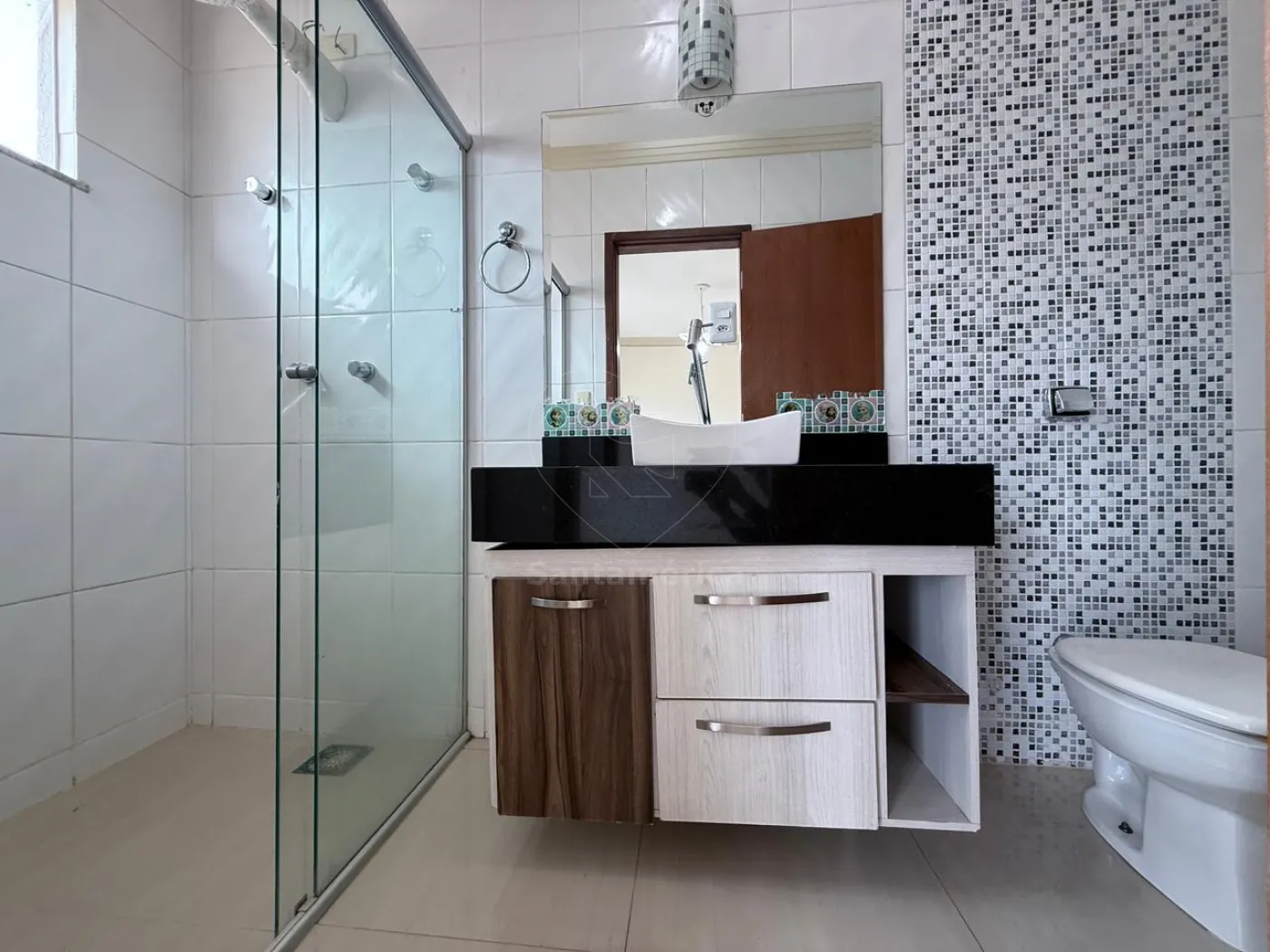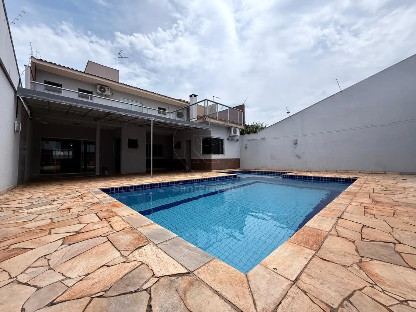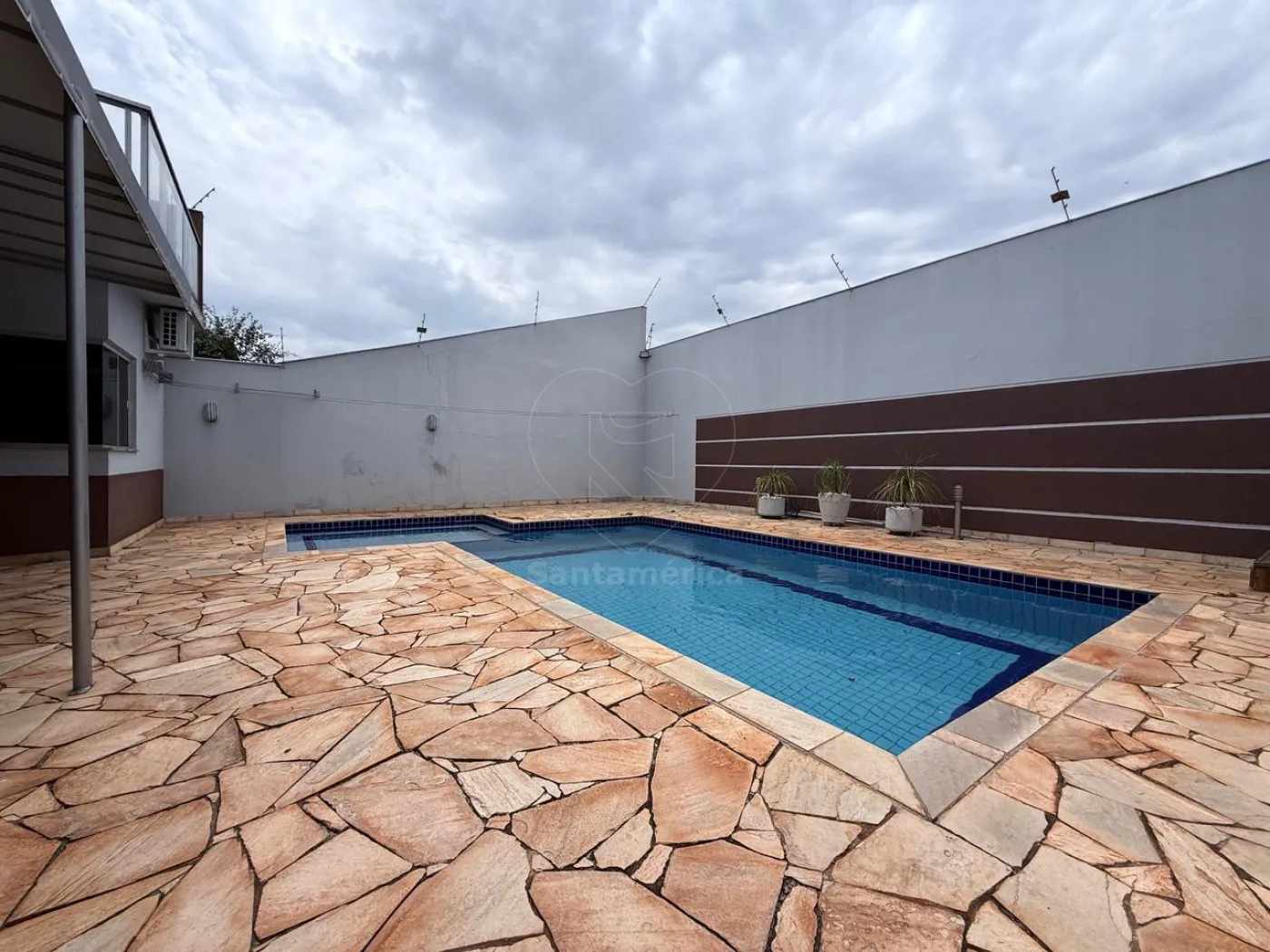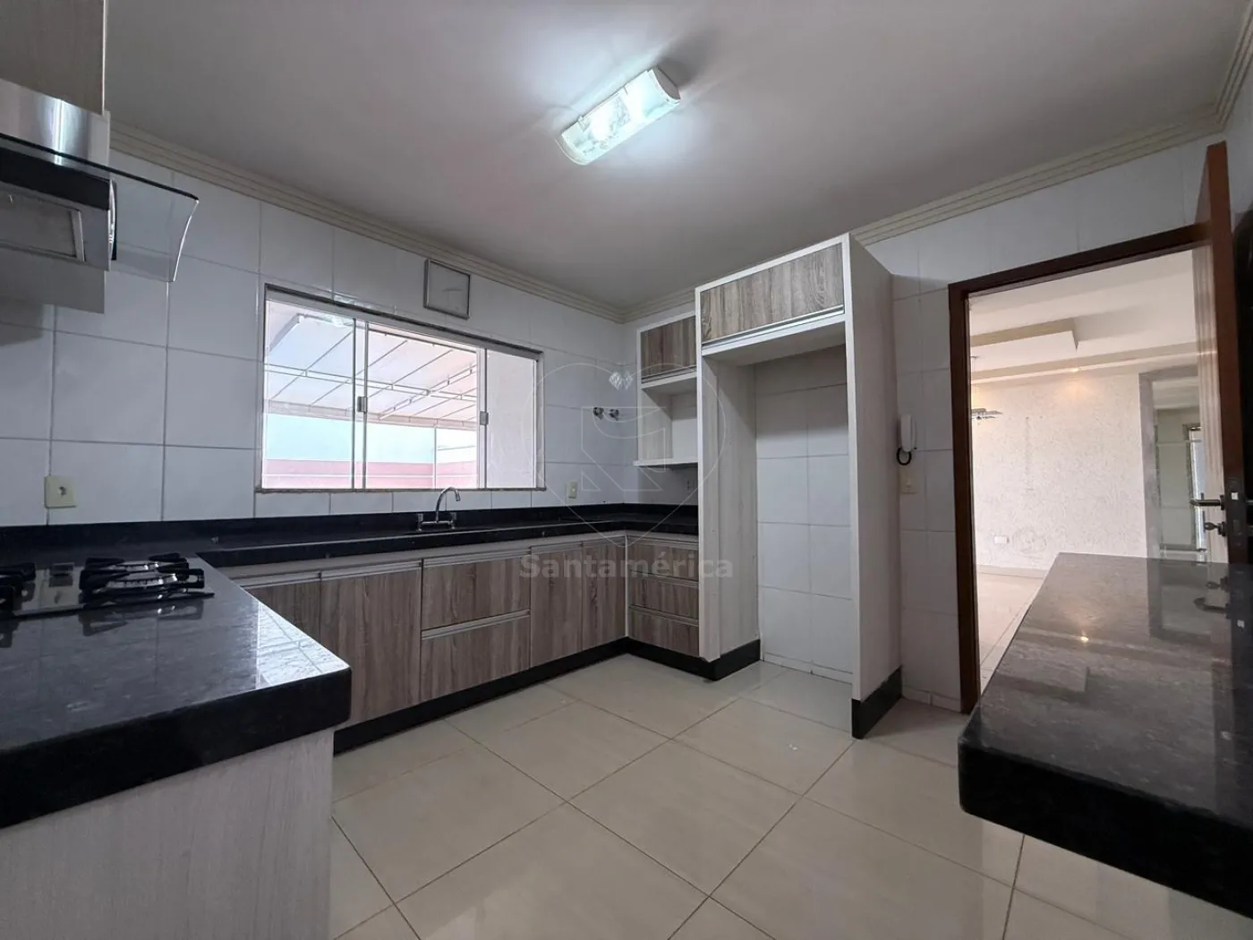 No piso inferior, há mais 1 suíte com ar-condicionado, cozinha planejada equipada com exaustor, forno e cooktop de quatro bocas, sala ampla em 2 ambientes com ar-condicionado de 18.000 BTUs e rack de TV planejado, lavabo, lavanderia, churrasqueira e piscina. Conta ainda com banheiro social, canil e garagem para quatro carros, sendo 2 vagas cobertas.