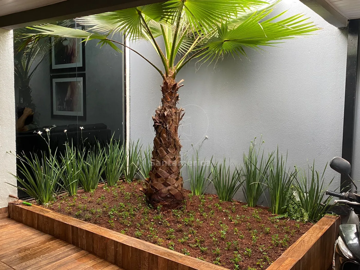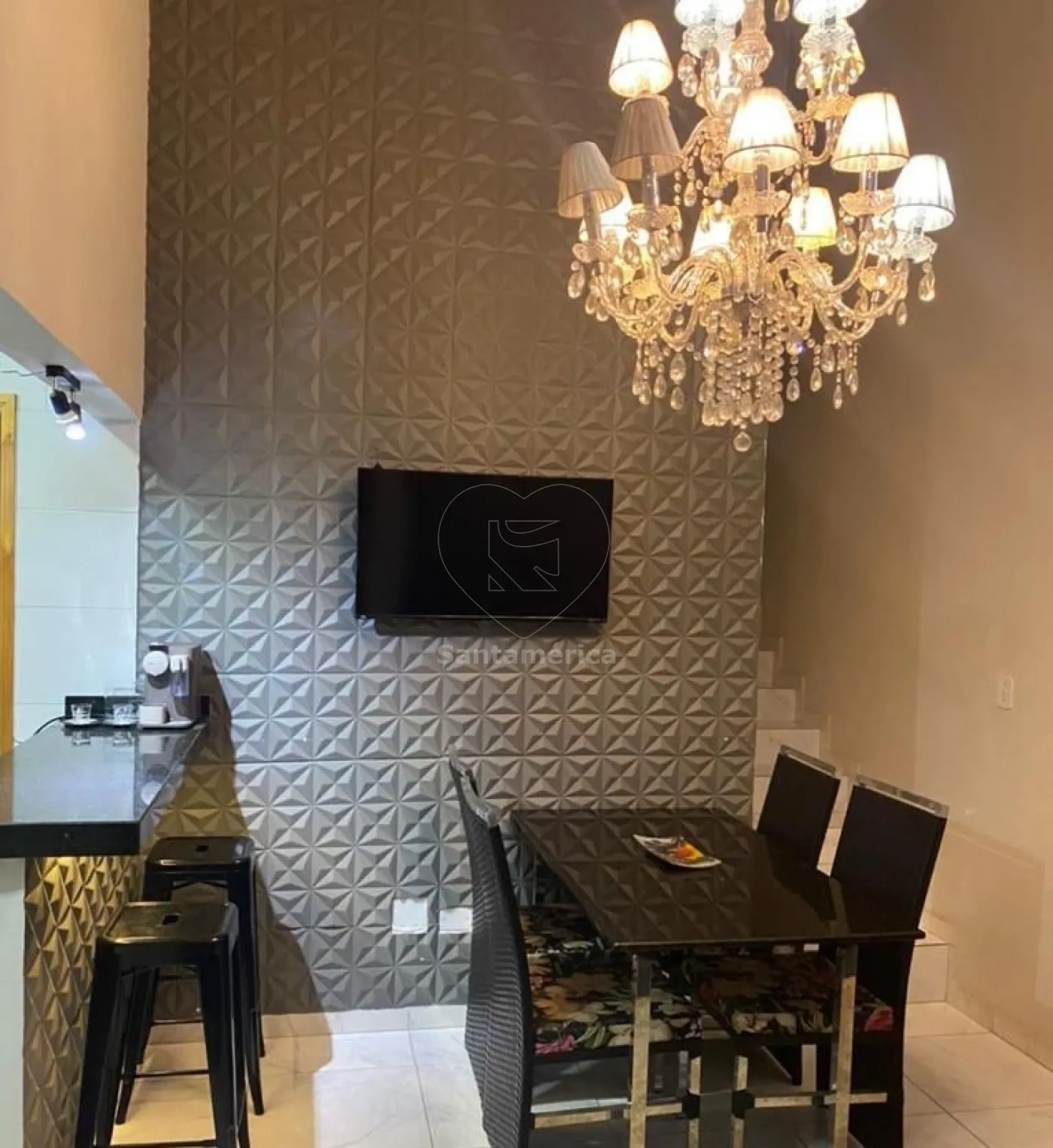 Dispõe de 3 quartos, sendo 1 suíte com armários, cama king size e ar-condicionado. Os demais quartos têm cama de casal, painel de TV e ar-condicionado. A sala para 2 ambientes possui pé-direito alto, vidro fixo na fachada, lustre elegante e parede com gesso 3D. Cozinha planejada com cooktop, exaustor e micro-ondas. Banheiro social com gabinete, box em vidro e nicho. Área de serviço, área gourmet com churrasqueira e garagem coberta. Paisagismo com iluminação na entrada valoriza a fachada.