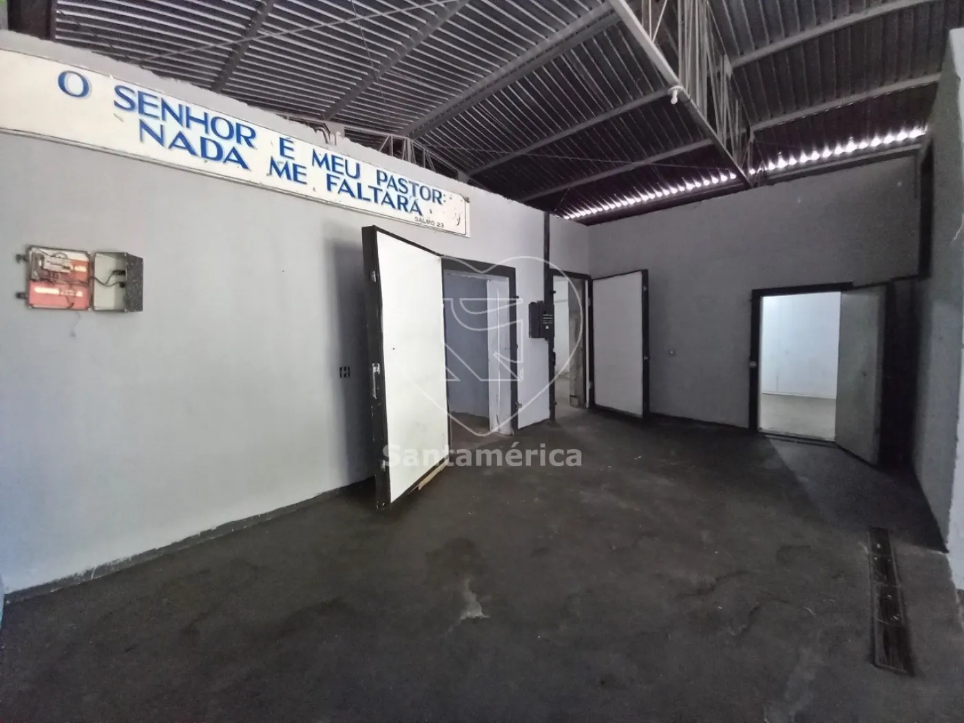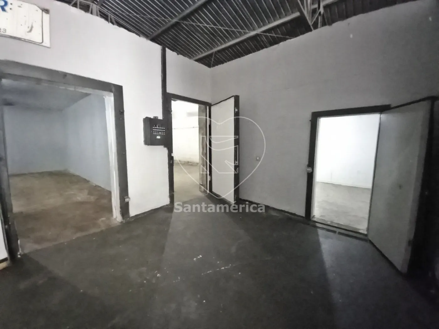 Barracão com 240m² de área edificada sendo distribuídos em escritório, copa, 3 banheiros, 5 câmaras de refrigeração/congelamento, doca para carga e descarga.