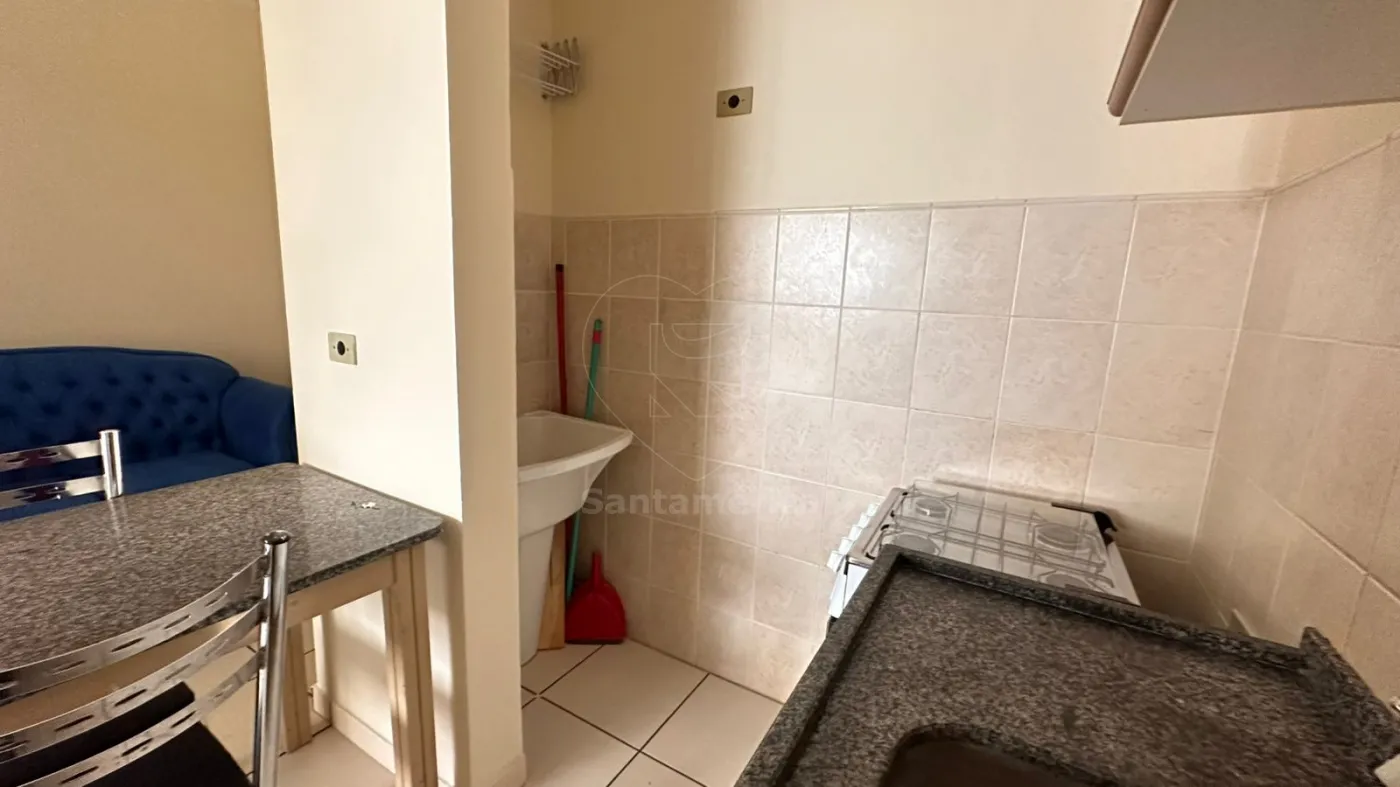 Semi mobiliado, o imóvel conta com 1 quartos equipado com armários, ar condicionado e persiana. A cozinha possui pia em tampo de granito, armários, fogão e geladeira. A sala dispõe de sofá, armários e mesa com quatro cadeiras. O banheiro conta com gabinete e box em acrílico.