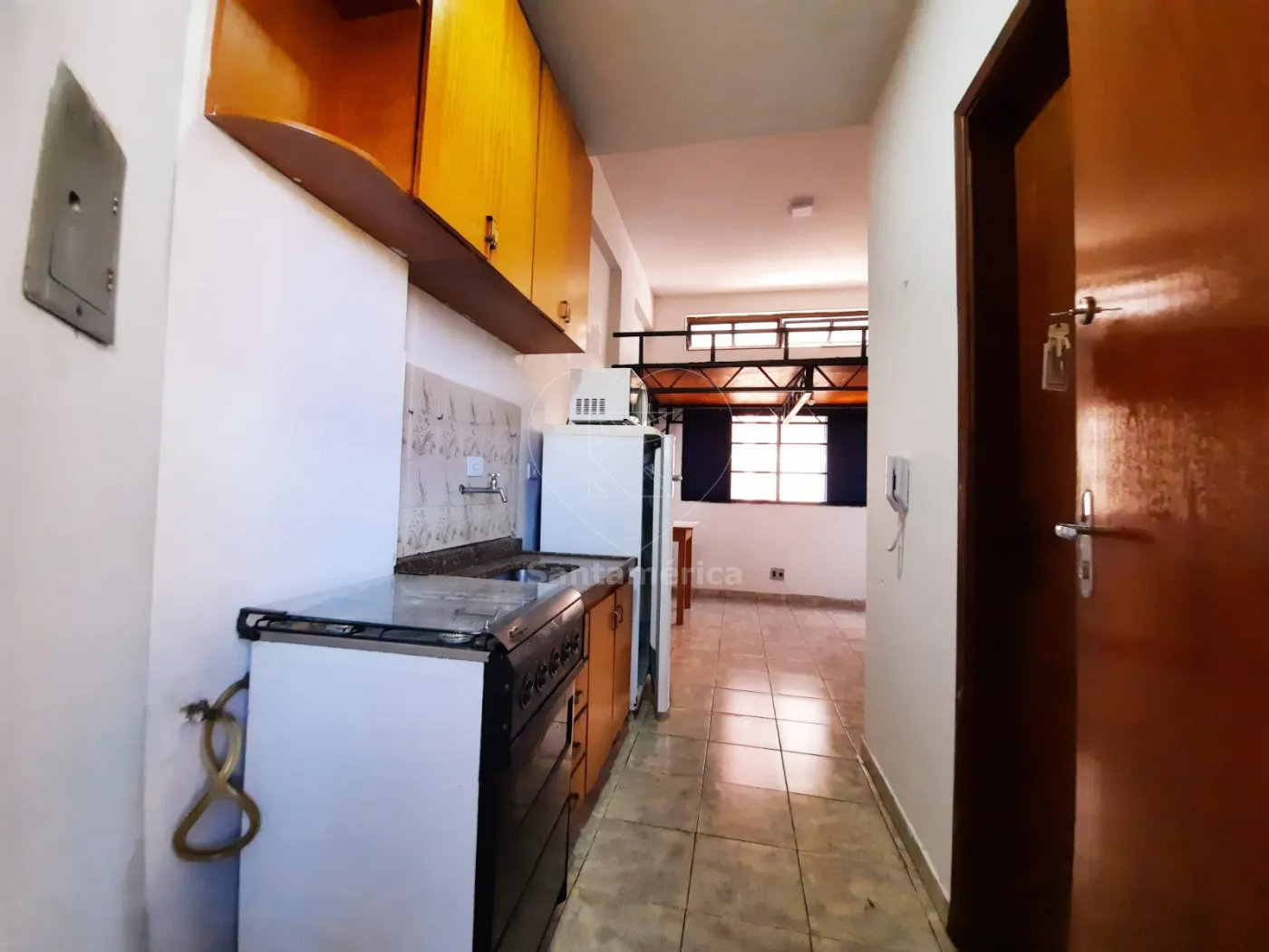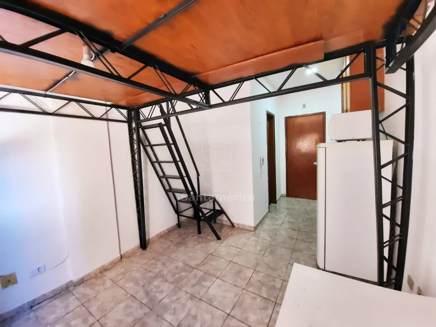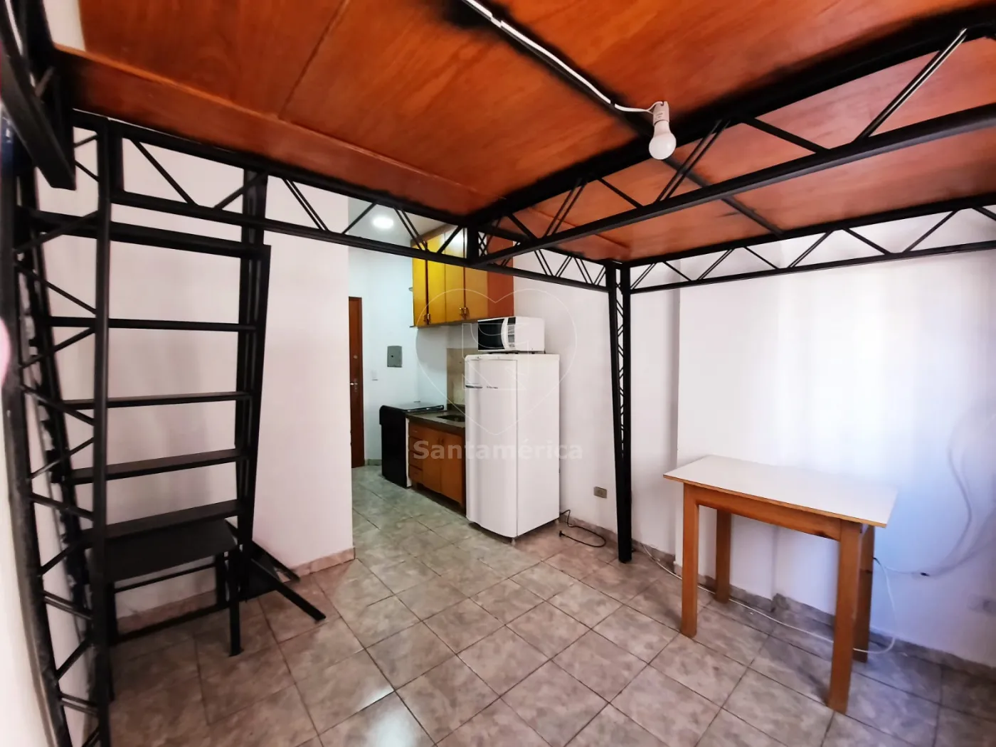 Área útil com 16m², com armários de cozinha, com geladeira, fogão e micro-ondas. Repartição para dois andares com armação de ferro, para colocar uma cama.