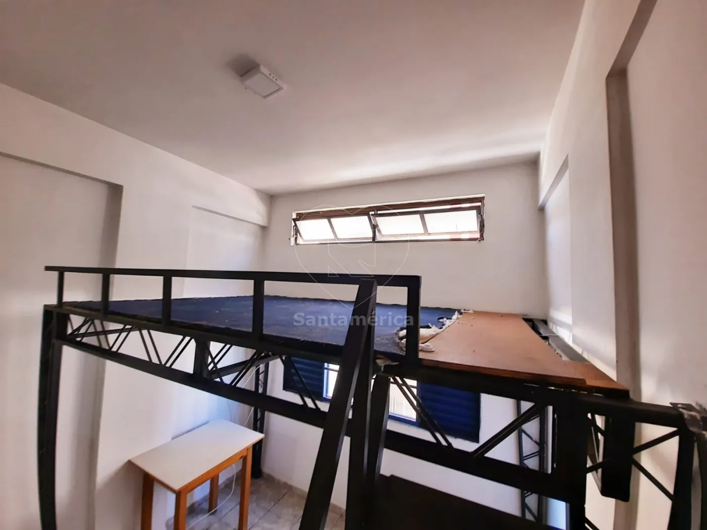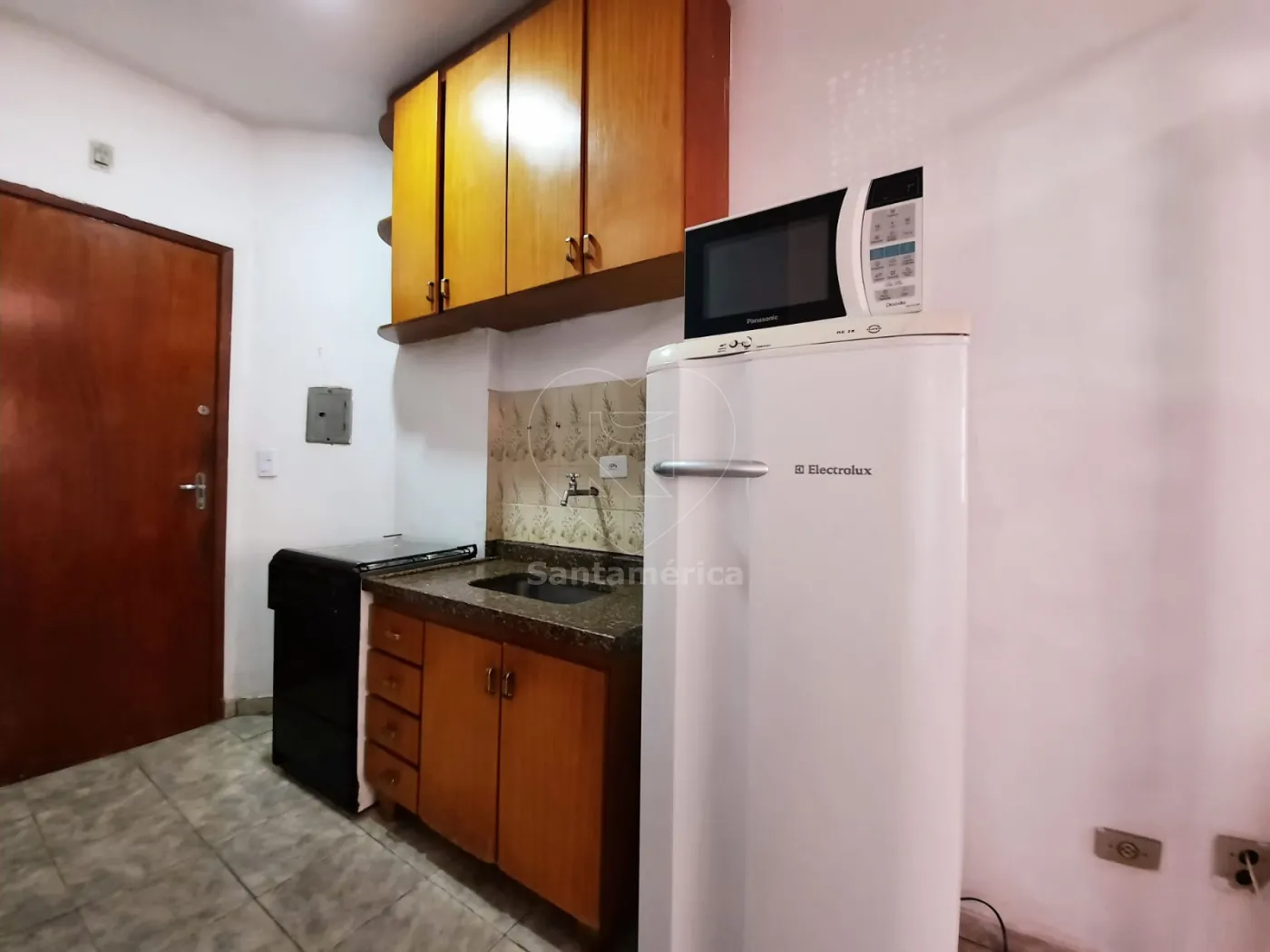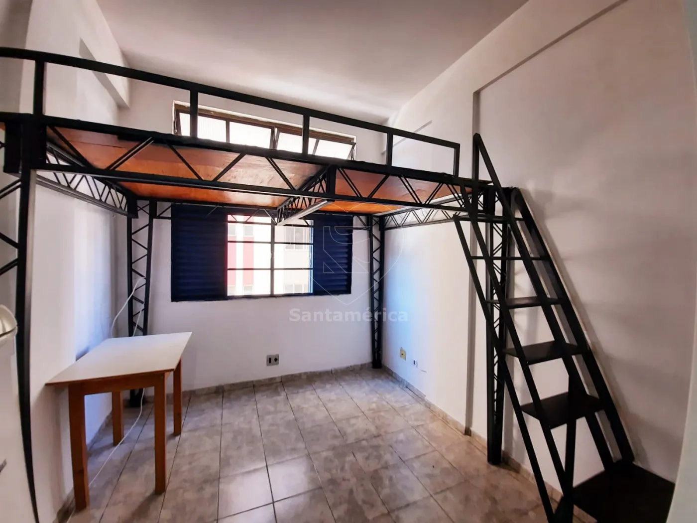 Área útil com 16m², com armários de cozinha, com geladeira, fogão e micro-ondas. Repartição para dois andares com armação de ferro, para colocar uma cama.