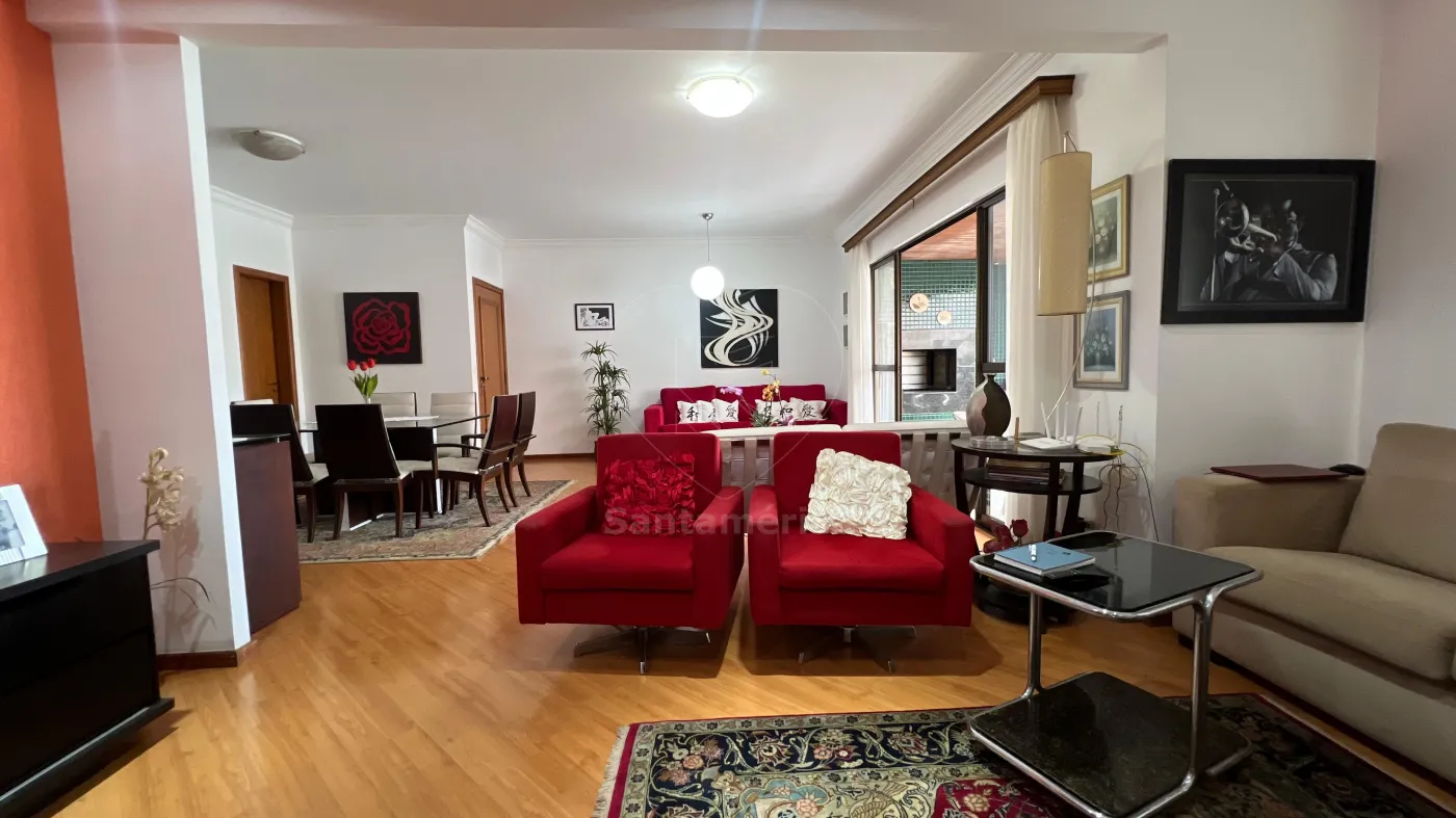 Lindo e espaçoso apartamento de frente com 253m² de área total e 163m² de área privativa. Oferece 3 suítes, lavabo, dormitório de empregada e uma ampla sala com 3 ambientes e ar condicionado. A varanda com churrasqueira proporciona um excelente espaço de lazer, além de contar com uma área de serviço espaçosa. Possui 50m² de armários embutidos e 2 vagas de garagem. Excelente oportunidade pois os proprietários estão de mudança para outra cidade, possibilitando a negociação dos móveis existentes no apartamento.