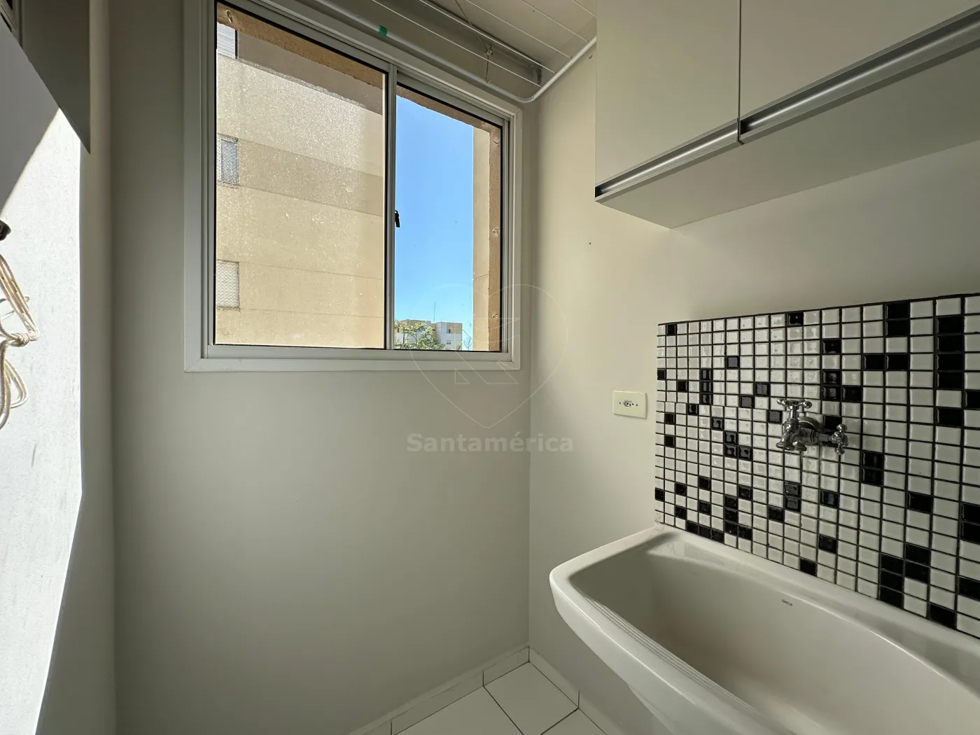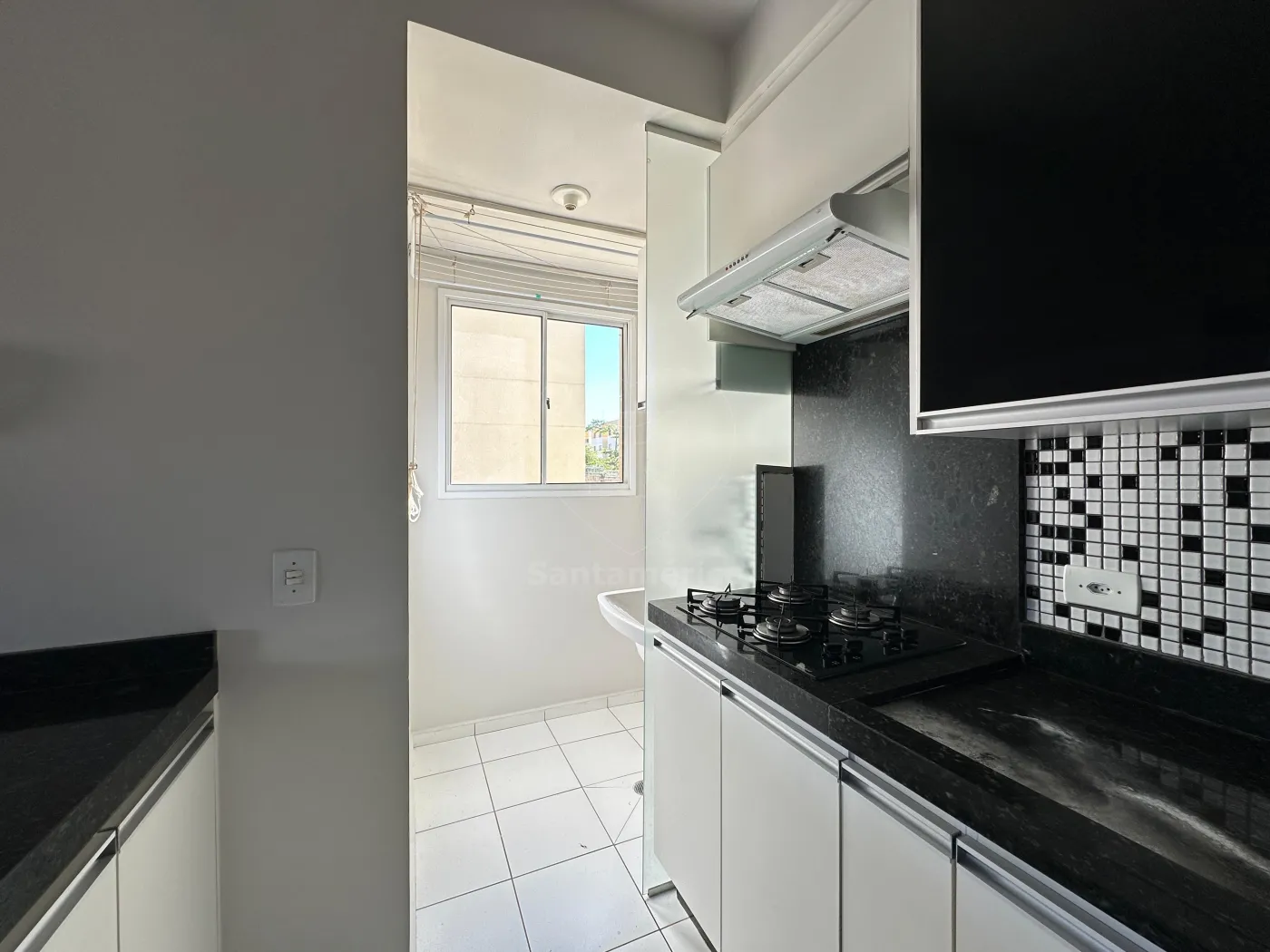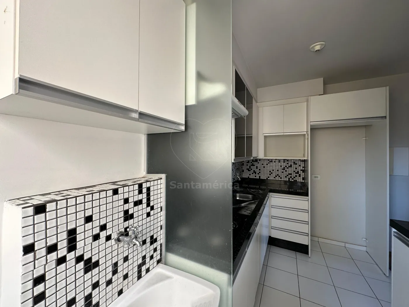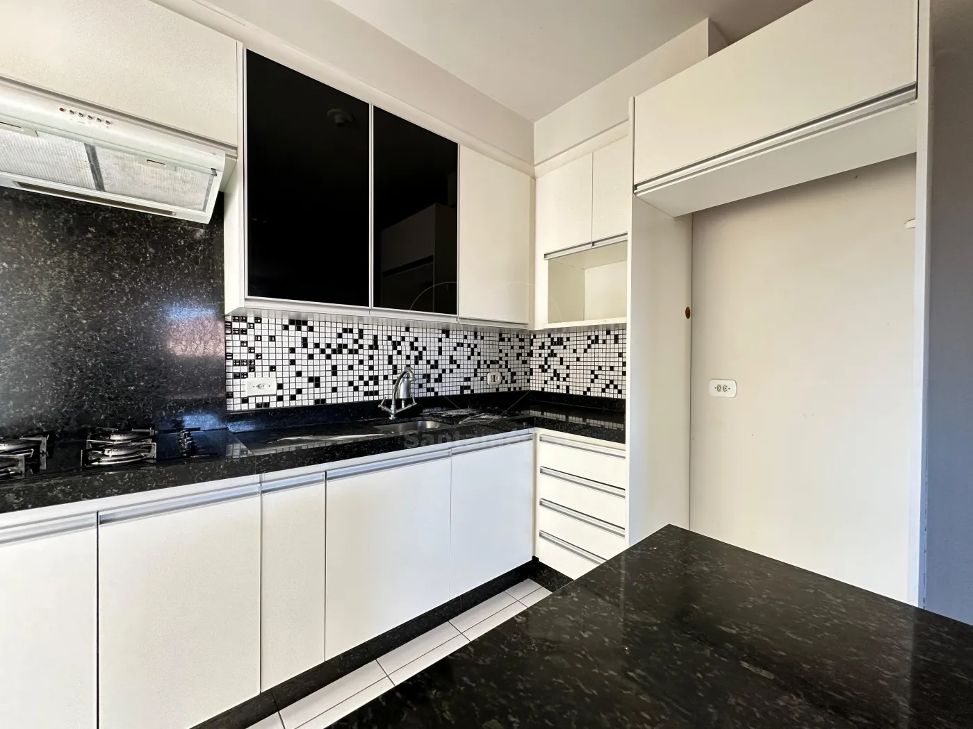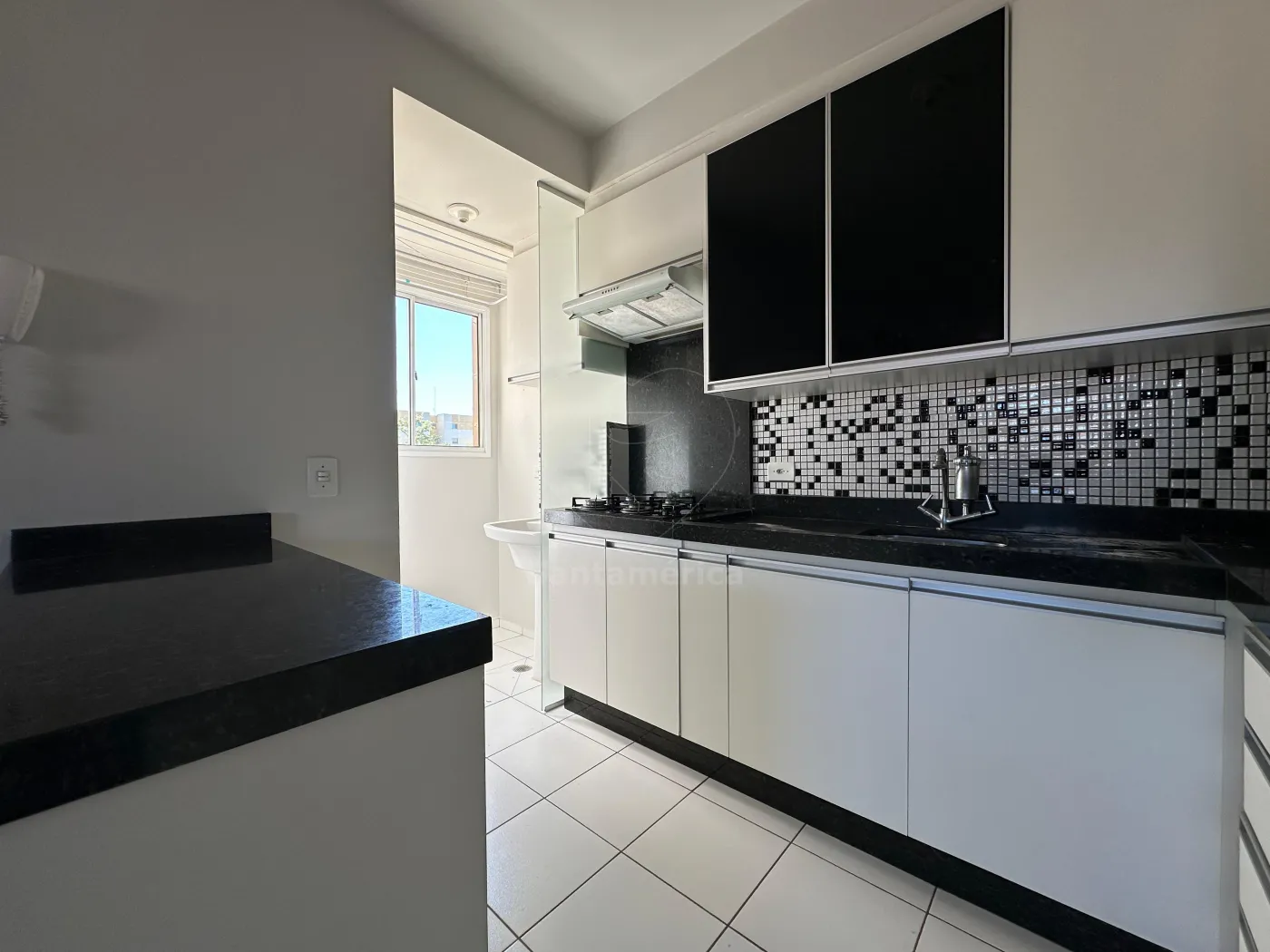 A cozinha planejada apresenta uma combinação sofisticada de cores em branco e preto, que além de elegante, é atemporal. Está equipada com fogão cooktop e exaustor. O banheiro social possui box em vidro, gabinete planejado e pia com bancada em mármore. O apartamento conta ainda com área de serviço e uma vaga de garagem.