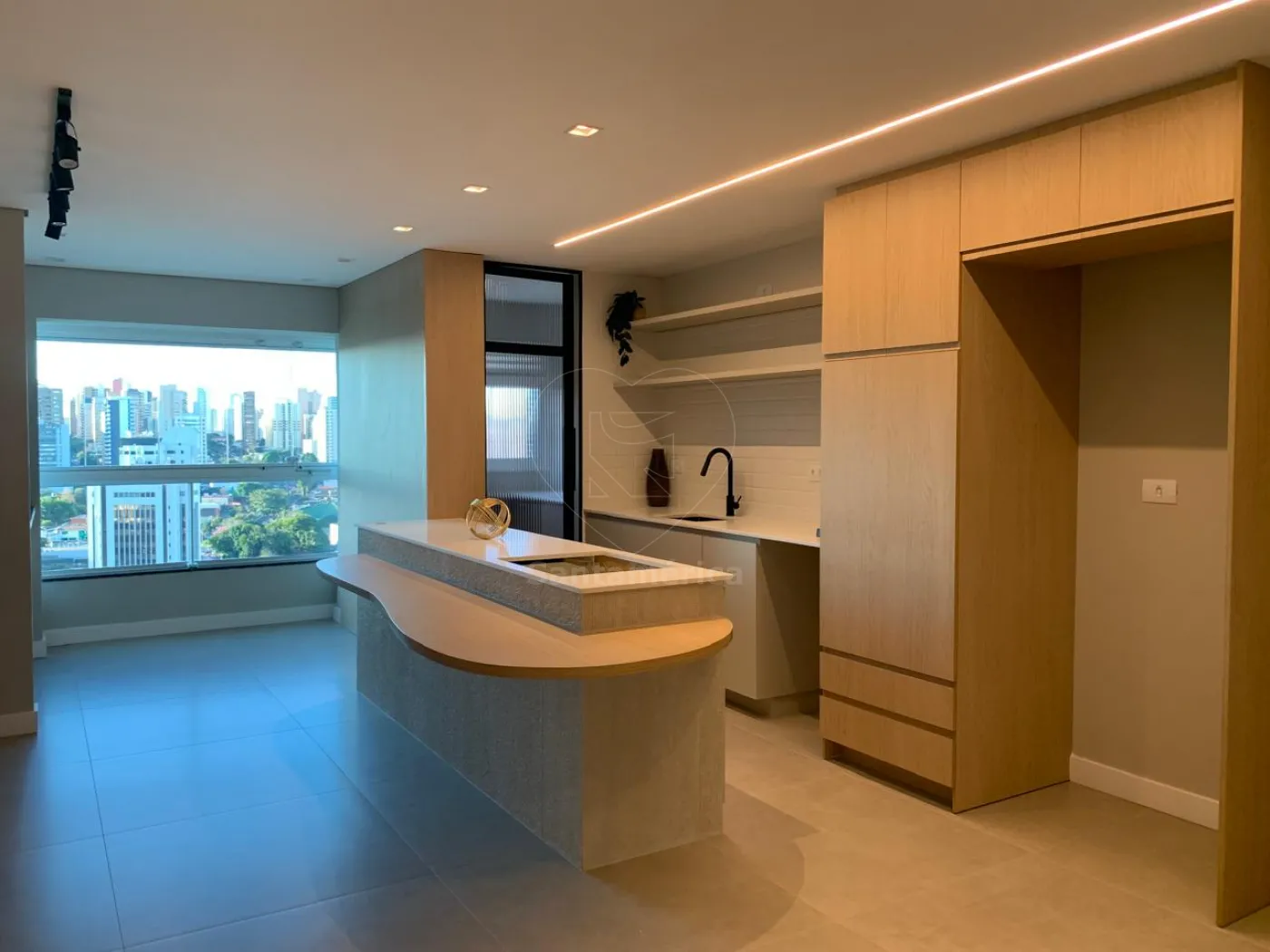 Os acabamentos incluem piso em porcelanato e laminado, iluminação diferenciada e ambientes bem distribuídos. Localizado em andar alto, o apartamento se destaca pela vista aberta e pela sensação de amplitude.