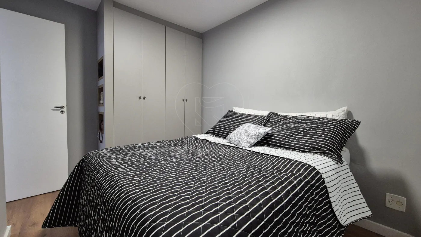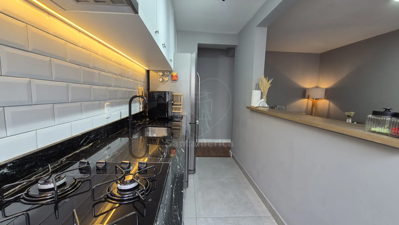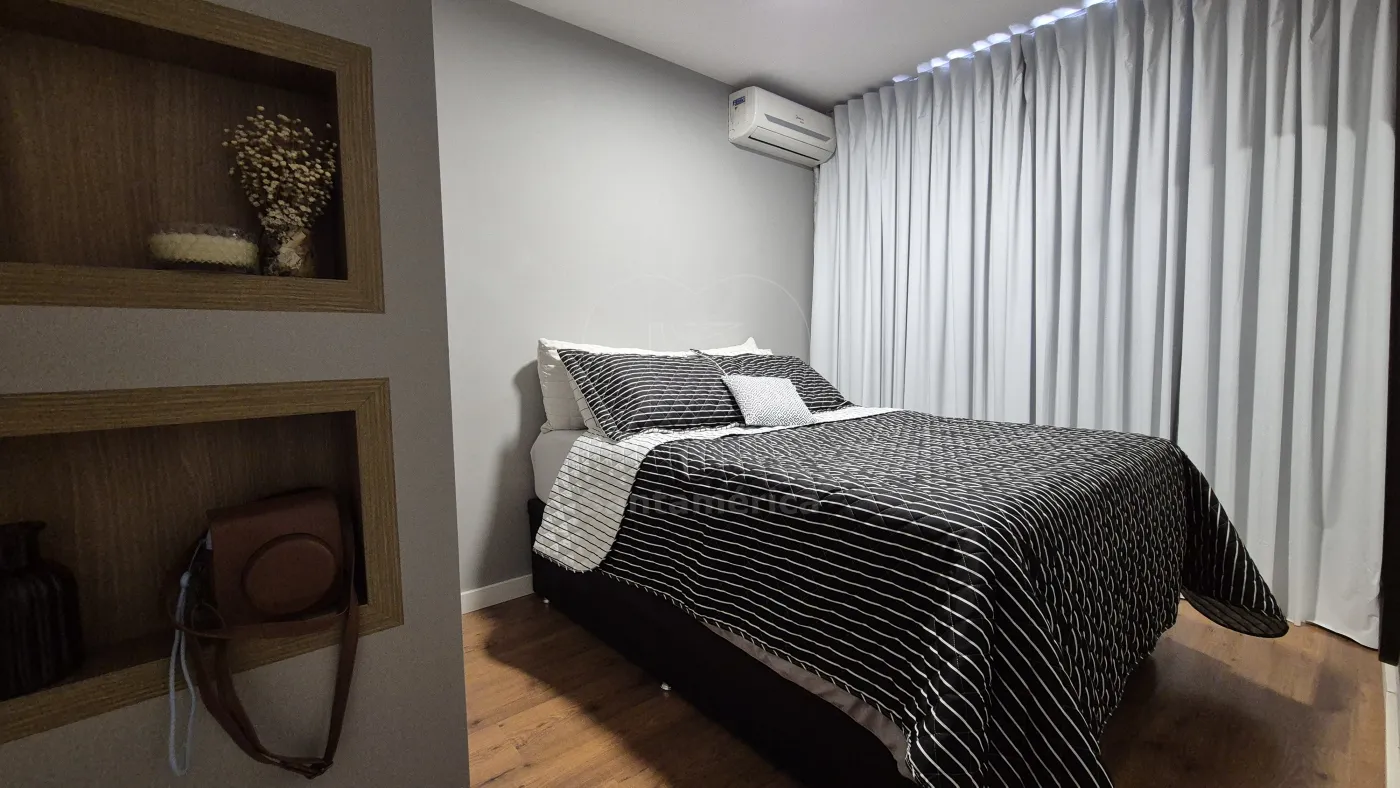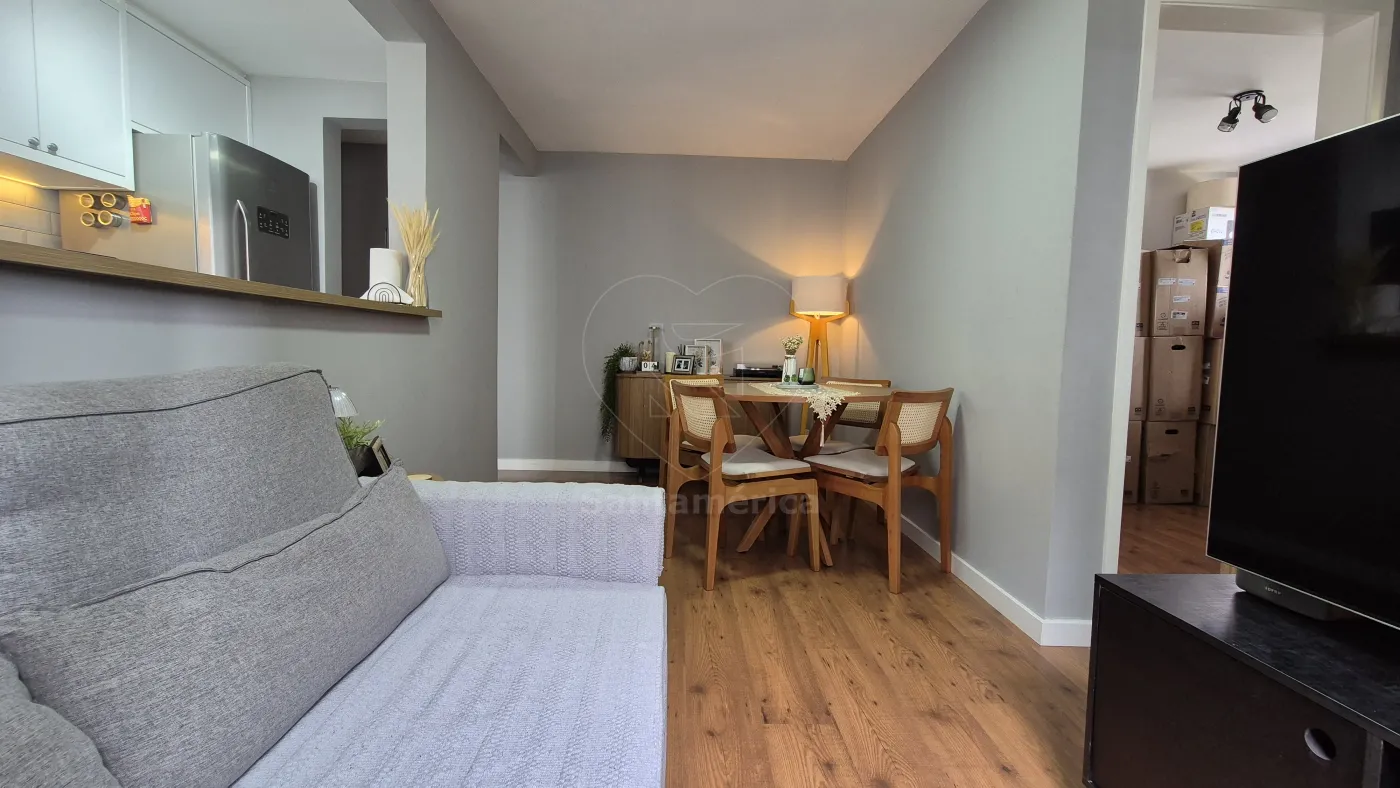 O imóvel conta com 2 quartos, sendo 1 deles com armário planejado, ar-condicionado e cama. Sala para 2 ambientes com aparador, painel de televisão e sofá. Cozinha com armários planejados, geladeira, cooktop, lava-louças e lava e seca. O banheiro social com gabinete planejado, cuba de sobrepor, box em vidro, área de serviço e uma vaga de garagem coberta. Sala e dormitórios com laminado.
