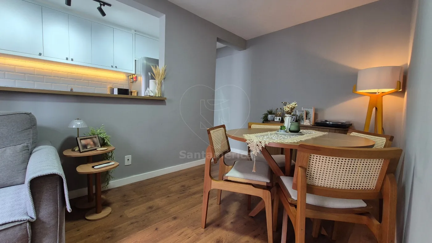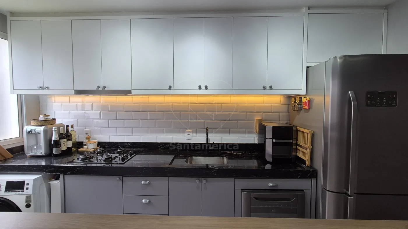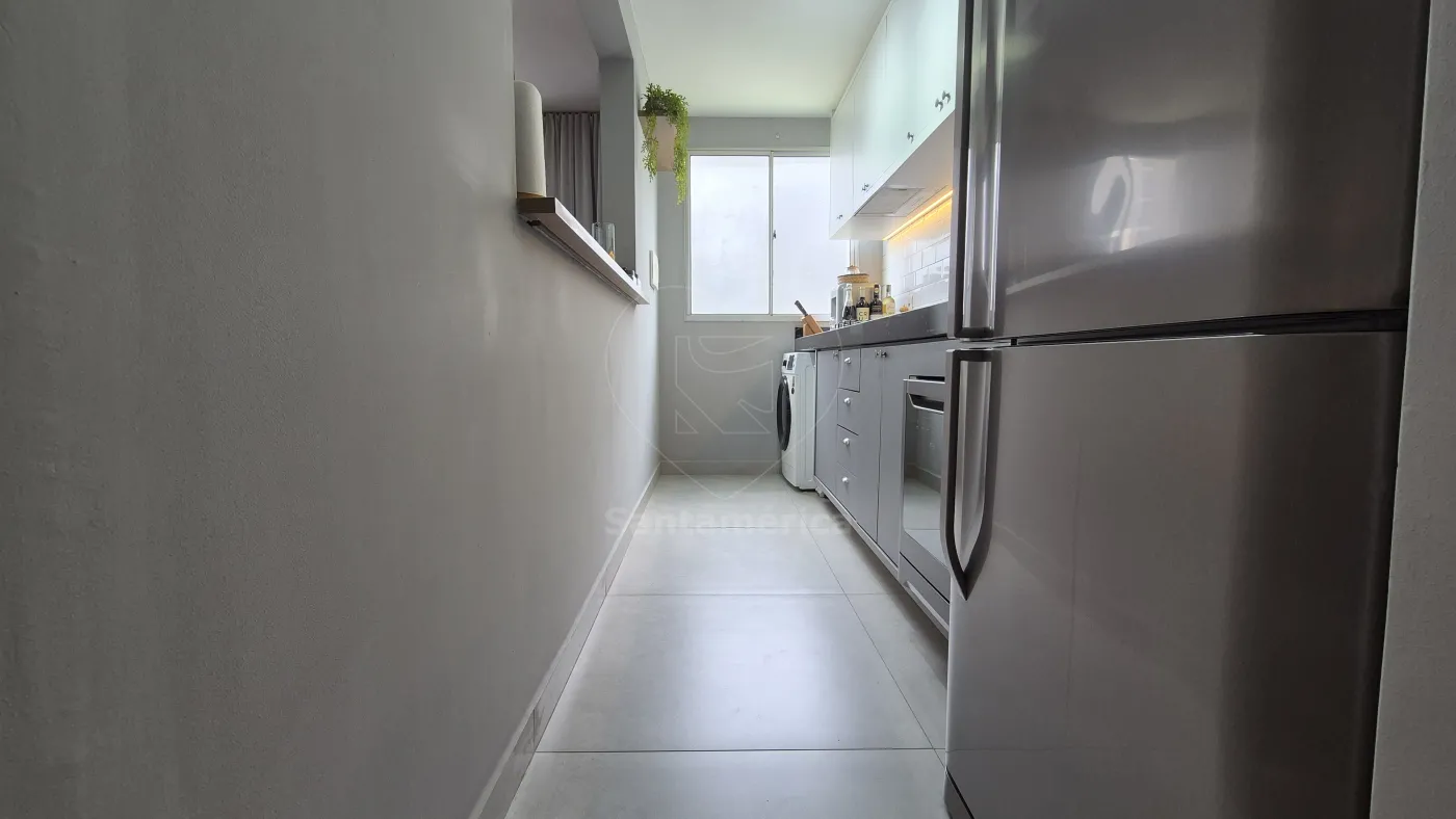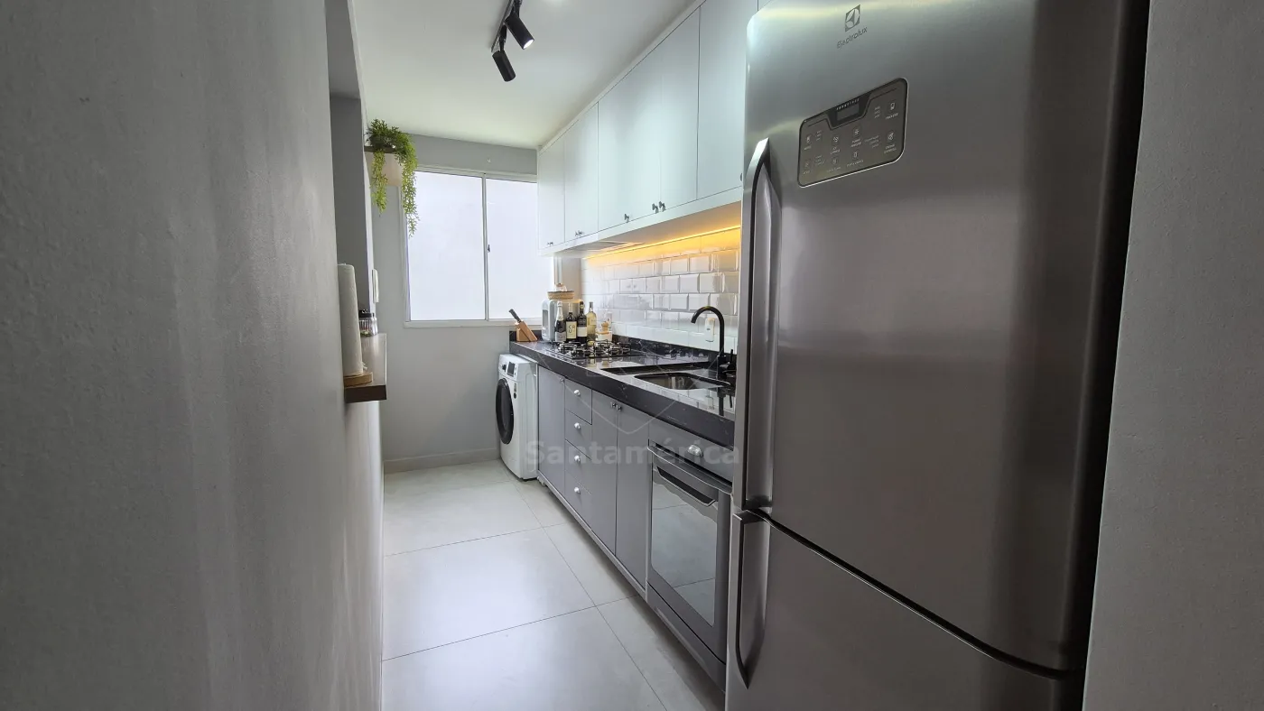 O imóvel conta com 2 quartos, sendo 1 deles com armário planejado, ar-condicionado e cama. Sala para 2 ambientes com aparador, painel de televisão e sofá. Cozinha com armários planejados, geladeira, cooktop, lava-louças e lava e seca. O banheiro social com gabinete planejado, cuba de sobrepor, box em vidro, área de serviço e uma vaga de garagem coberta. Sala e dormitórios com laminado.