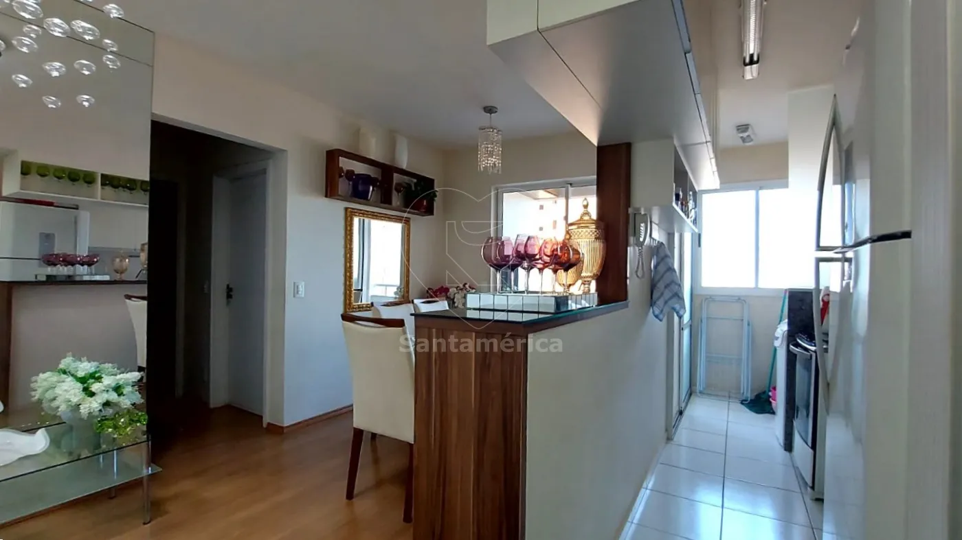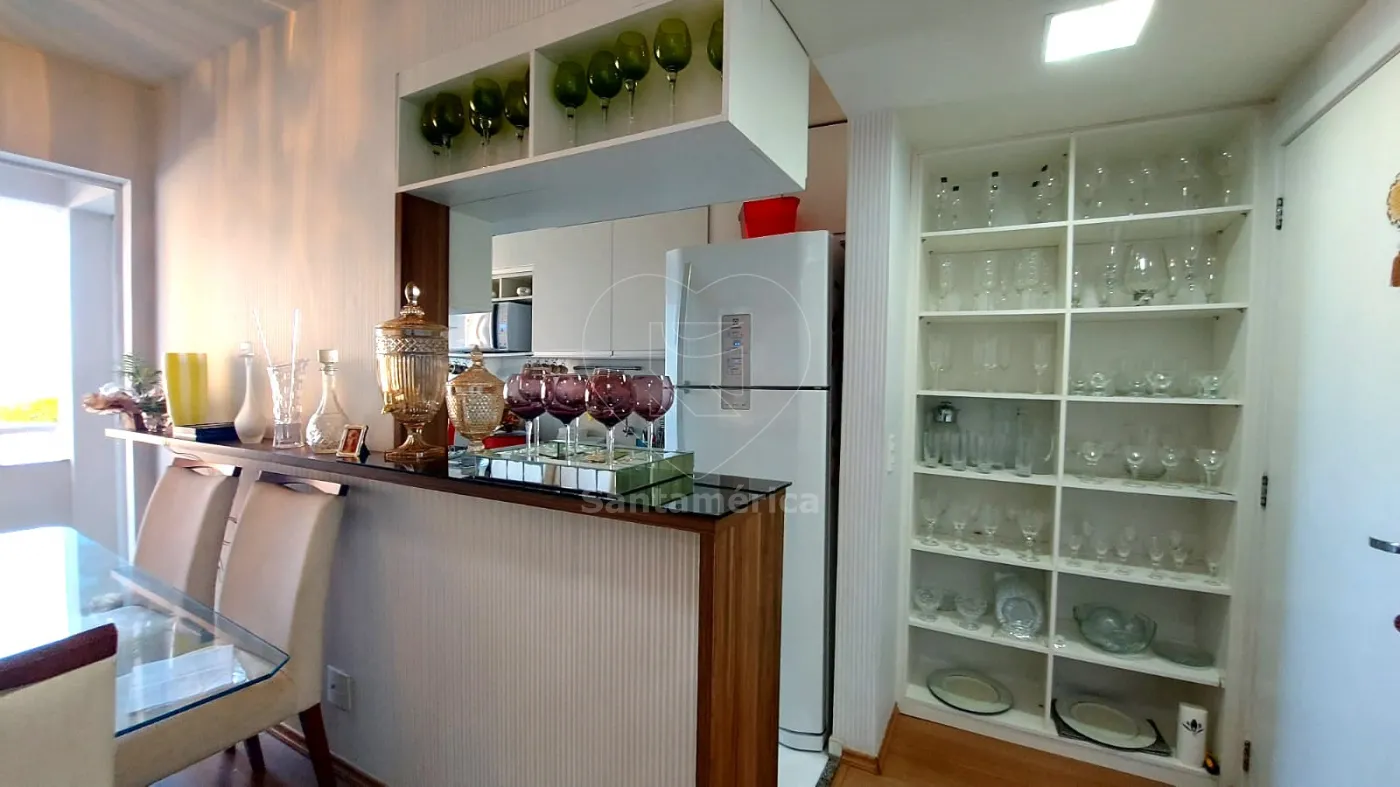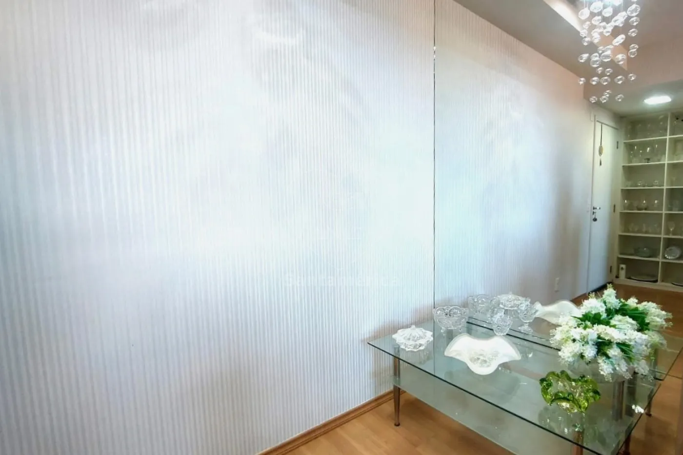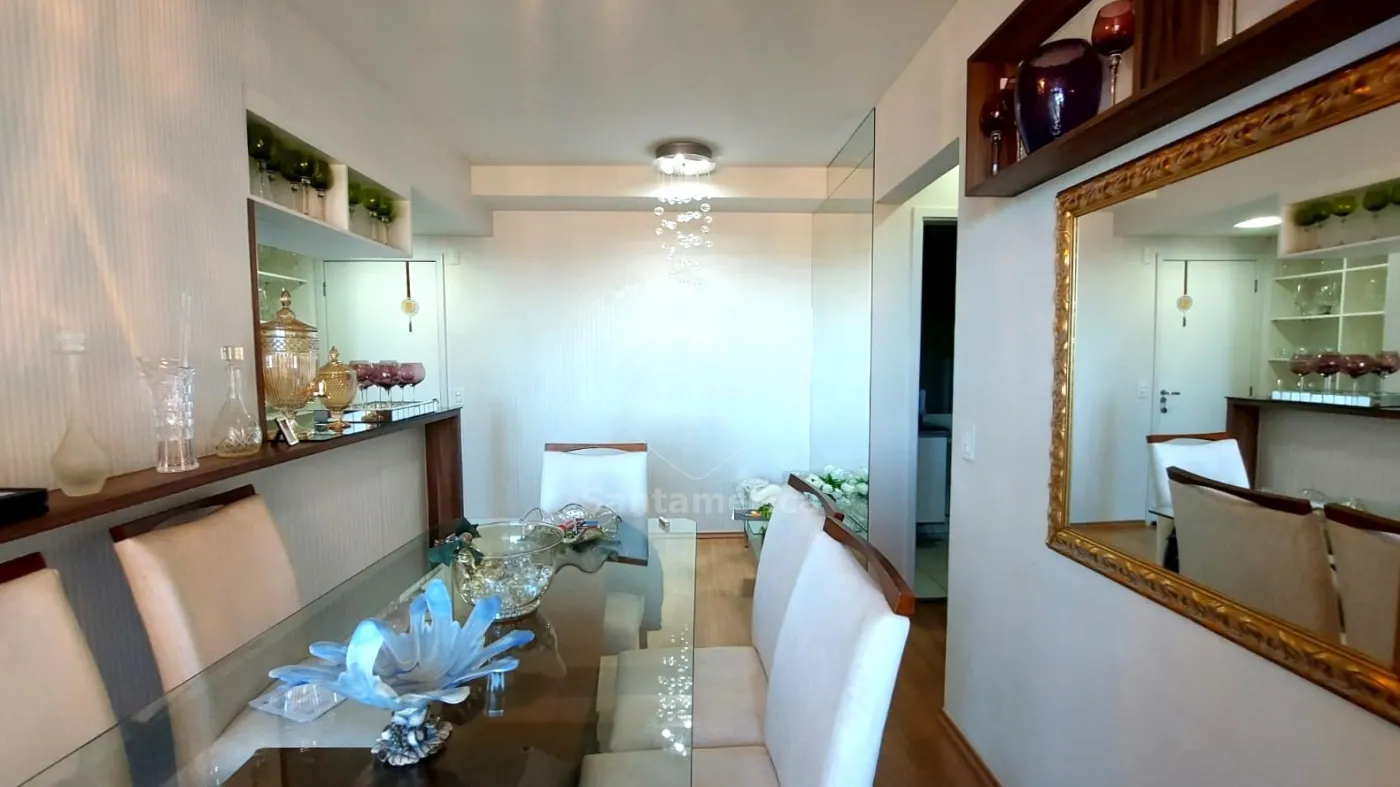 A sala para dois ambientes é prática e aconchegante, com papel de parede importado na sala de jantar, dois lustres de cristal, espelho decorativo na sala de jantar e outro espelho no banheiro, que também conta com box em vidro, porta xampu em vidro e acabamento em papel de linho. Na sala de estar, dois nichos grandes novos embutidos oferecem espaço e organização.