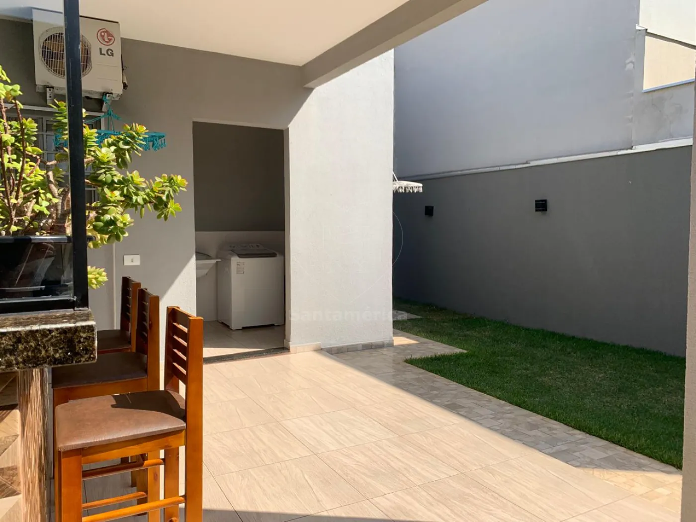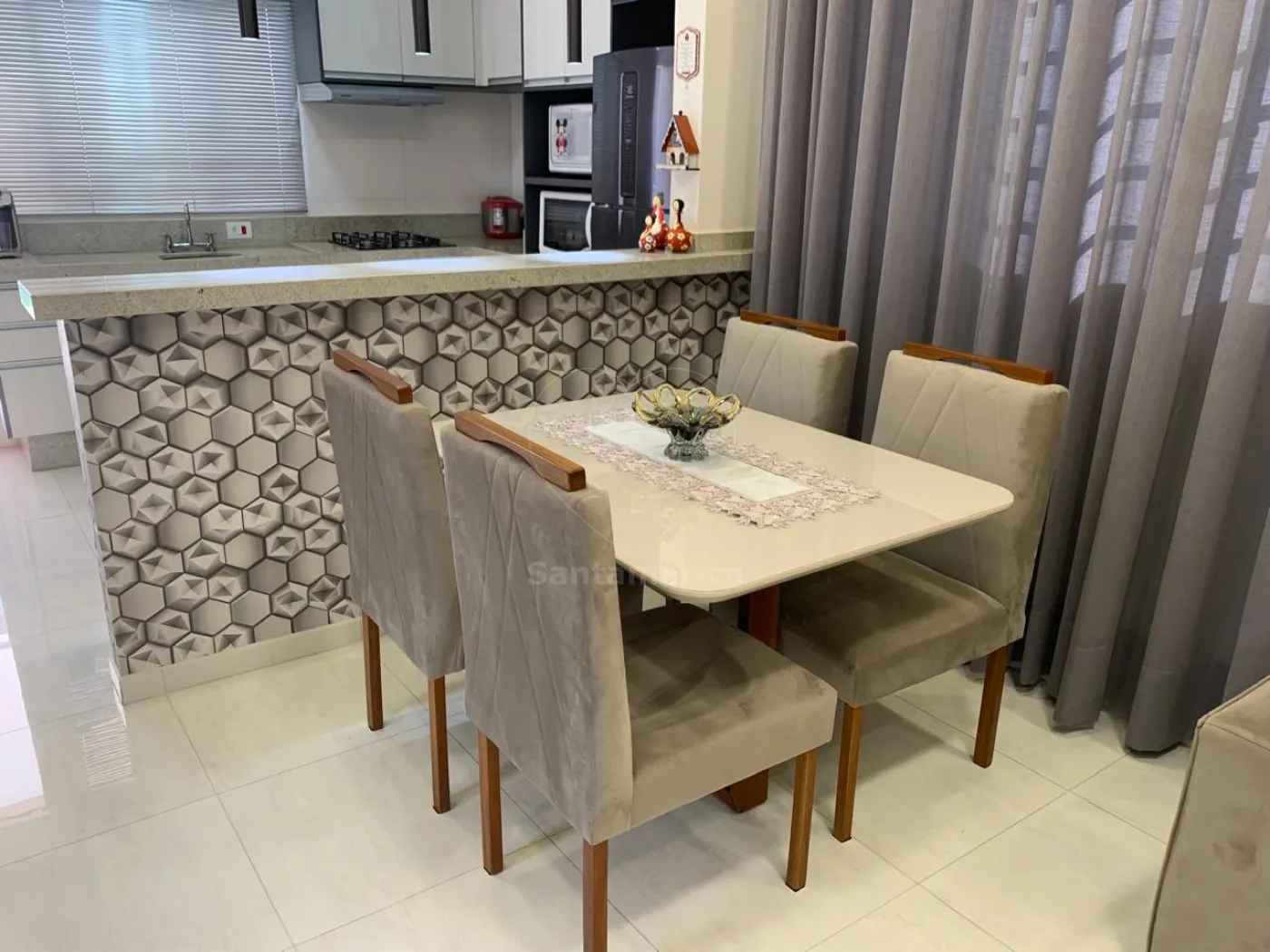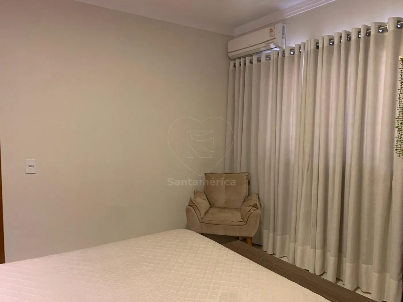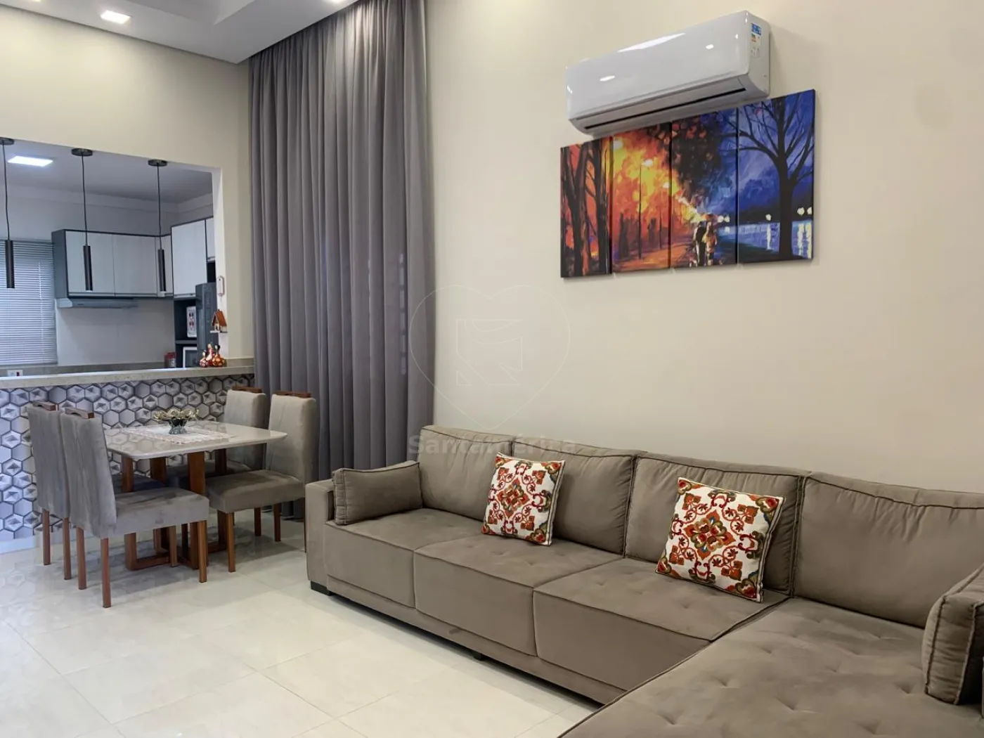 Contendo 3 quartos sendo 1 suíte. Guarda-roupa planejado no quarto principal da suíte, ar condicionado e iluminação em LED, sala com painel de televisão, rack, iluminação em LED, ar condicionado e cortina em linho, a cozinha é estilo americana, já com armários planejados, suggar , cocktop, persiana e iluminarias, banheiros com box em vidro e pia em porcelanato, jardim de inverno, área de serviço com varal de parece, área gourmet com banquetas. A casa possui 2 vagas de garagem.