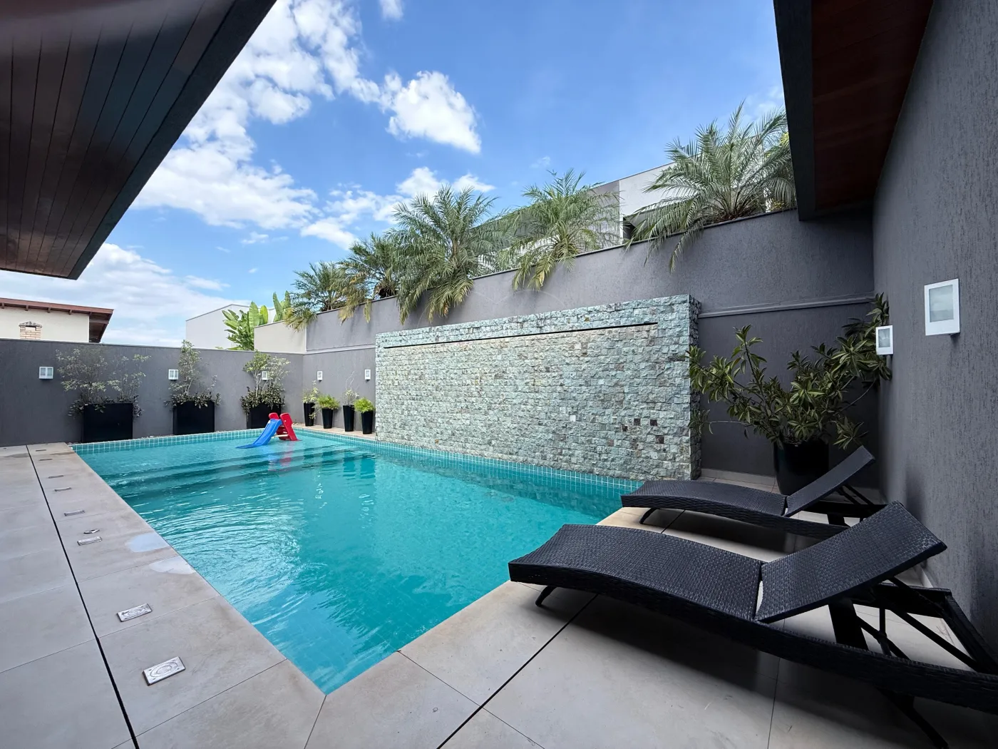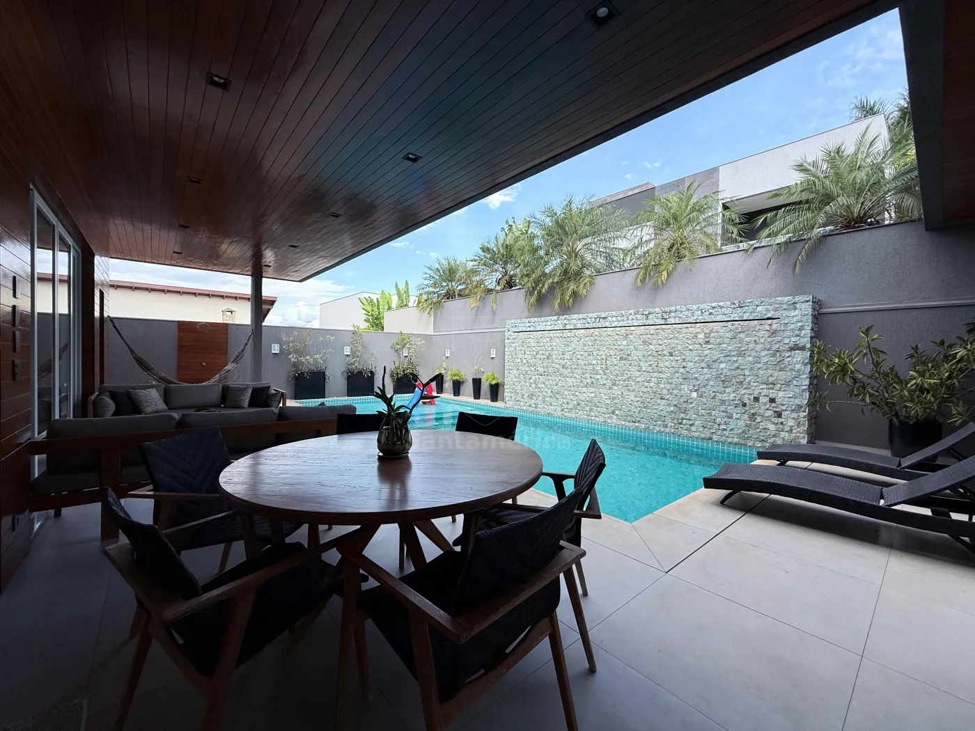 A área externa é um verdadeiro refúgio, com piscina aquecida de 40m², cascata revestida em pedra Hijal natural e suporte embutido para mesa e guarda-sol.